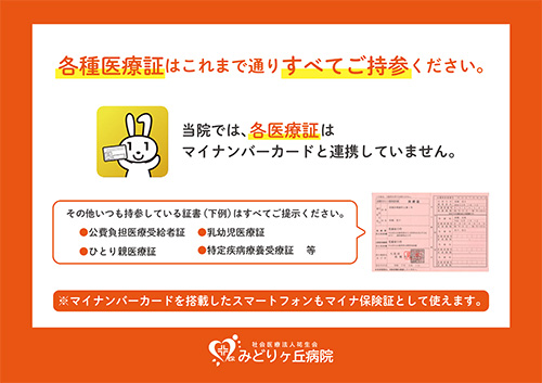 各種医療証につきましてはマイナンバーカードと連携しておりませんので、これまで通りすべてご持参ください。